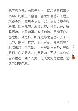 无不忘之意。自然无为对一切思想意识置之 不理。比喻主不喜客,客无颜自退。不退主 烦客不安。意执不忘心不安,忘心态意识得 解放。胡思乱想、海阔天空,异想天开,野 鹤闲游,信马游疆、放任自流、无动于衷。 乱之极,动之极,即是定静之自然。天下本 无事,庸人自找之,心不起乱,乱从何生? 心欲求静,求者是乱。不思动不思静,思想 是何?自如是法,自然是道。不认自本心识 自本性者,难入无为,见闻觉知之觉性,念 念自如妄自消。 23