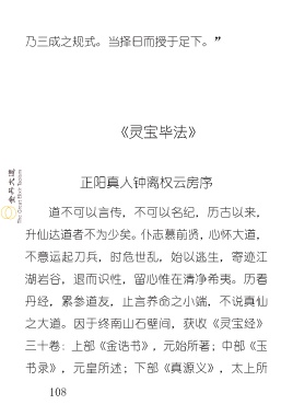 乃三成之规式。当择日而授于足下。” 《灵宝毕法》 正阳真人钟离权云房序 道不可以言传,不可以名纪,历古以来, 升仙达道者不为少矣。仆志慕前贤,心怀大道, 不意运起刀兵,时危世乱,始以逃生,寄迹江 湖岩谷,退而识性,留心惟在清净希夷。历看 丹经,累参道友,止言养命之小端,不说真仙 之大道。因于终南山石壁间,获收《灵宝经》 三十卷:上部《金诰书》,元始所著;中部《玉 书录》,元皇所述;下部《真源义》,太上所 108