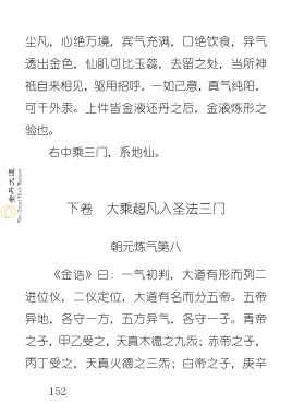 尘凡,心绝万境,宾气充满,口绝饮食,异气 透出金色,仙肌可比玉蕊,去留之处,当所神 祇自来相见,驱用招呼,一如己意,真气纯阳, 可干外汞。上件皆金液还丹之后,金液炼形之 验也。 右中乘三门,系地仙。 下卷..大乘超凡入圣法三门 朝元炼气第八 《金诰》曰:一气初判,大道有形而列二 进位仪,二仪定位,大道有名而分五帝。五帝 异地,各守一方,五方异气,各守一子。青帝 之子,甲乙受之,天真木德之九炁;赤帝之子, 丙丁受之,天真火德之三炁;白帝之子,庚辛 152