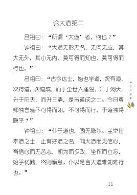 论大道第二 吕祖曰:“所谓‘大道’者,何也?” 钟祖曰:“大道无形无名,无问无应,其 大无外,其小无内,莫可得而知也,莫可得而 行也。” 吕祖曰:“古今达士,始也学道,次有道, 次得道,次道成,而于尘世入蓬岛,升于洞天, 升于阳天,而升三清,是皆道成之士。今日尊 师独言道不可得而知,不可得而行,于道独得 隐乎?” 钟祖曰:“仆于道也,固无隐尔。盖举世 奉道之士,止有好道之名,闻大道而无信心, 有信心而无苦志,朝为而夕改,坐作而立忘, 始乎忧勤,终则懈怠。仆以是言大道难知难行 也。” 11