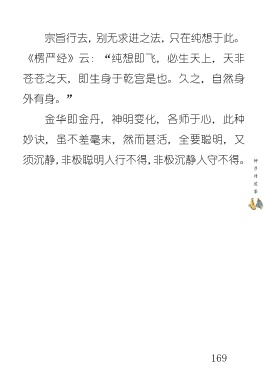 宗旨行去,别无求进之法,只在纯想于此。 《楞严经》云:“纯想即飞,必生天上,天非 苍苍之天,即生身于乾宫是也。久之,自然身 外有身。” 金华即金丹,神明变化,各师于心,此种 妙诀,虽不差毫末,然而甚活,全要聪明,又 须沉静,非极聪明人行不得,非极沉静人守不得。 169