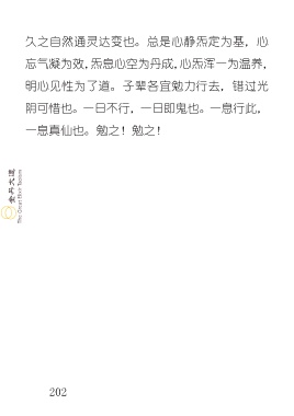 久之自然通灵达变也。总是心静炁定为基,心 忘气凝为效,炁息心空为丹成,心炁浑一为温养, 明心见性为了道。子辈各宜勉力行去,错过光 阴可惜也。一日不行,一日即鬼也。一息行此, 一息真仙也。勉之!勉之! 202