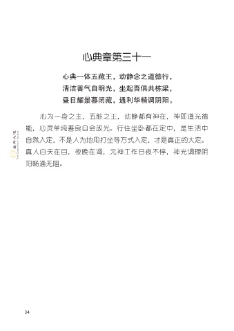 心典章第三十一 心典一体五藏王,动静念之道德行, 清洁善气自明光,坐起吾俱共栋梁, 昼日耀景暮闭藏,通利华精调阴阳。 心为一身之主,五脏之王,动静都有神在,神即道光德 能,心灵单纯善良自会放光。行住坐卧都在定中,是生活中 自然入定,不是人为地用打坐等方式入定,才是真正的大定。 真人白天在目,夜晚在肾,元神工作日夜不停,神光调理阴 阳畅通无阻。 34