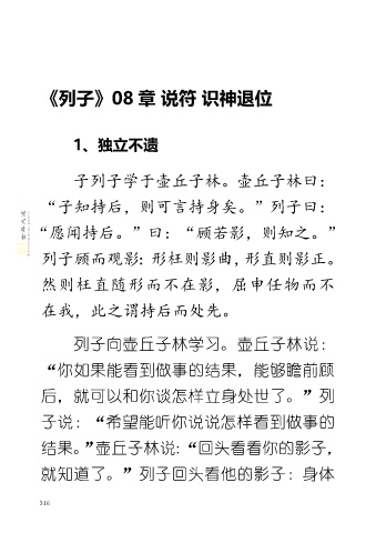 《列子》08 章 说符 识神退位 1、独立不遗 子列子学于壶丘子林。壶丘子林曰: “子知持后,则可言持身矣。”列子曰: “愿闻持后。”曰:“顾若影,则知之。” 列子顾而观影:形枉则影曲,形直则影正。 然则枉直随形而不在影,屈申任物而不 在我,此之谓持后而处先。 列子向壶丘子林学习。壶丘子林说: “你如果能看到做事的结果,能够瞻前顾 后,就可以和你谈怎样立身处世了。”列 子说:“希望能听你说说怎样看到做事的 结果。”壶丘子林说:“回头看看你的影子, 就知道了。”列子回头看他的影子:身体 316