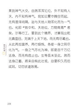 果到神气大交,自然浑浑沦沦,外不知有人 天,内不知有神气,宛如云雾中腾空而起, 无有渣滓间隔,迨与天地人物浑化而为一气 也。化即“致中和,天地位,万物育焉”者 矣。尔等行工,要到此个境界,才算现出乾 元真面目,充满于上天下地,而无有尽藏也。 从此再加温养,再行煅炼,务使一身之阴尽 化为气,一身之气尽化为神,即是百千万亿 法身,而无有底止也。生等虽未至此,然而 法身已蓄,将来自有此壮观,总要积久而后 成耳,切勿求速效焉。 256
