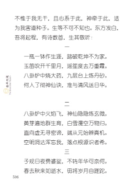 不惟于我无干,且心系于此,神牵于此,适 为我害道种子。生等不可不知也。东方发白, 吾将起程,有诗数首,生其敬听: 一 一瓶一钵作生涯,踏破乾坤不为家。 玉笛吹开千里月,瑶笙度去万重霞。 八卦炉中烧大药,九层台上炼丹砂。 何人了彻神仙诀,准与清风送日华。 二 八卦炉中火焰飞,神仙隐隐炼玄微。 黄芽遍地群生育,白雪漫空万物归。 直向虚无寻密谛,端从元始辨真机。 空明洞达浑忘我,落点根源识者希。 三 子规日夜费婆娑,不转年华可奈何。 春去秋来如逝水,毋将岁月自蹉跎。 506