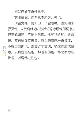 则又自然於真性命中, 露出端倪,而为我本来之元神也。 《圆觉经 . 偈》曰:“金刚藏,当知如来 寂灭性,未尝有终始。若以轮迴心思惟即旋復。 但至轮迴际,不能入佛海。比如销金矿,金非 销,故有虽復本来金,终以销成就一真金体, 不復重为矿也。盖金矿非金也,销之而后成金 者,以有金之性也,种性非佛也。炼之而后成 佛者,以有佛之性也。 262