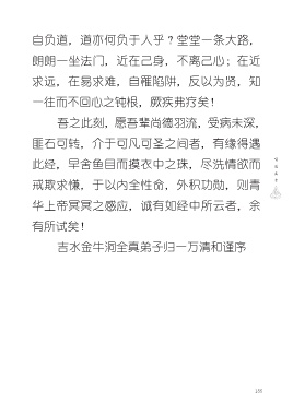 自负道,道亦何负于人乎?堂堂一条大路, 朗朗一坐法门,近在己身,不离己心;在近 求远,在易求难,自罹陷阱,反以为贤,知 一往而不回心之钝根,厥疾弗疗矣! 吾之此刻,愿吾辈尚德羽流,受病未深, 匪石可转,介于可凡可圣之间者,有缘得遇 此经,早舍鱼目而摸衣中之珠,尽洗情欲而 戒欺求慊,于以内全性命,外积功勋,则青 华上帝冥冥之感应,诚有如经中所云者,余 有所试矣! 吉水金牛洞全真弟子归一万清和谨序 155