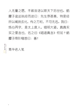 人无量之愿,不敢诳语以欺天下后世也。鹤 臞子逡巡执经而进曰:先生序甚善,特是经 所以阐扬玄化,传之万祀,不可无名。我曰: 炼心两字,是太上度人、唱明大道、真真实 实之要言也,名之曰《唱道真言》何如?鹤 臞子降阶稽首曰:善! ............................................................ 青华老人笔 4