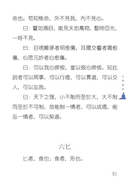 命也。苟知惟命,外不見我,內不見心。 曰:譬如兩目,能見天地萬物,暫時回光, 一時不見。 曰:目視雕琢者明愈傷,耳聞交響者聰愈 傷,心思元妙者心愈傷。 曰:勿以我心揆彼,當以彼心揆彼。知此 說者可以周事,可以行德,可以貫道,可以交 人,可以忘我。 曰:天下之理,小不制而至於大,大不制 而至於不可制,故能制一情者,可以成德,能 忘一情者,可以契道。 六匕 匕者,食也;食者,形也。 31