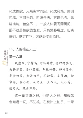 化成性欲,元精离宫而出,化成凡精,就叫 浊精,不可当药。阴阳丹法,对境无心,元 精清纯,色空不二,一般人休要问鼎阴阳, 那不过是性欲的发泄。只有处静用虚,心清 德明,欲定性平,才能处尘而脱俗。 16、人的根在天上 第十六章 致虚极,守静笃,万物并作,吾以观其复。 夫物芸芸,各归其根,归根曰静,静曰复命, 复命曰常,知常曰明,不知常,妄作凶,知 常容,容乃公,公乃全,全乃天,天乃道, 道乃久,殁身不殆。 这一章讲道之根,也是人之根。知根就 会知道一切,不知根,在枝叶上忙乎,一辈 106