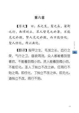 第六章 【原文】. 曰:爪之生,髮之長,榮衛 之行,無頃刻止。眾人皆見之於著,不能 見之於微,賢人見之於微,而不能任化。 聖人任化,所以無化。 【翻译】指甲之生,毛发之长,血行之 荣,气行之卫,昼夜周流,众人都能看到显 著的,不能看到微小的。贤人能看到微小的, 不能任化。圣人了独立不改之体,任周行不 殆之用,即任化,了独立不改之体,即无化。 道独立不改,周行不殆。 147