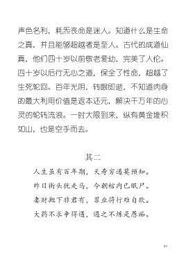 声色名利,耗炁丧命是迷人。知道什么是生命 之真,并且能够超越者是至人。古代的成道仙 真,他们四十岁以前敬老爱幼,完美了人伦。 四十岁以后行无心之道,保全了性命,超越了 生死轮回。百年光阴,转眼即逝,不知道肉身 的最大利用价值是返本还元,解决千万年的心 灵的轮转流浪。一时大限到来,纵有黄金堆积 如山,也是空手而去。 其二 人生虽有百年期,夭寿穷通莫预知。 昨日街头犹走马,今朝棺内已眠尸。 妻财抛下非君有,罪业将行难自欺。 大药不求争得遇,遇之不炼是愚痴。 69