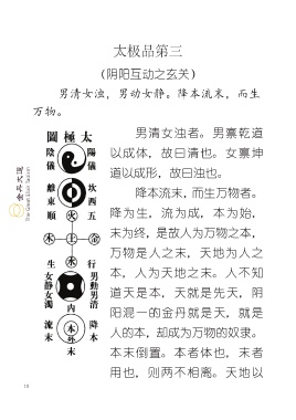 太极品第三 (阴阳互动之玄关) 男清女浊,男动女静。降本流末,而生 万物。 男清女浊者。男禀乾道 以成体,故曰清也。女禀坤 道以成形,故曰浊也。 降本流末,而生万物者。 降为生,流为成,本为始, 末为终,是故人为万物之本, 万物是人之末,天地为人之 本,人为天地之末。人不知 道天是本,天就是先天,阴 阳混一的金丹就是天,就是 人的本,却成为万物的奴隶。 本末倒置。本者体也,末者 用也,则两不相离。天地以 10