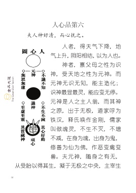 人心品第六 夫人神好清,而心扰之。 人者,得天气下降,地 气上升,阴阳相结,以为人也。 神者,禀父母之性为识 神,受天地之性为元神。而 元神无识无知,能主造化; 识神最显最灵,能应变无停。 元神是人之主人翁,而其神 之原,出于无极,道家呼为 铁汉,释氏唤作金刚,儒家 叫做魂灵,不生不灭,不增 不减,在身为魂,出身为鬼, 修善为仙为佛,作恶变禽变 兽。夫元神,随身之有无, 从受胎以得其生,凝于无极之中央,主宰生 16