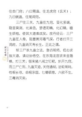 住命门窍;八曰胃蛊,住龙虎窍(玄关); 九曰蜣蛊,住尾闾窍。 三尸住三关,九蛊住九窍,变化多端, 隐显莫测,化美色,梦遗阳精,化幻境,睡 生烦恼,使其大道难成矣。故丹经云:三尸 九蛊在人身,阻塞黄河毒气深。行者打开三 洞府,九蛊消灭寿长生。正此之谓。 斩三尸杀九蛊之法,急访明师,低心求 指大道,请动孙悟空,在东海龙宫求来金箍 棒,打三关;借来猪八戒之钉耙,扒开九窍, 而三尸亡形,九蛊灭迹,关窍通彻,法轮常转, 性根长存,命根永固,七情顿息,六欲不生, 三毒消灭矣。 22
