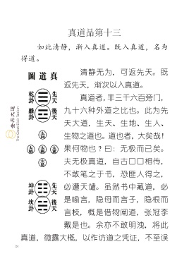 真道品第十三 如此清静,渐入真道。既入真道,名为 得道。 清静无为,可返先天。既 返先天,渐次以入真道。 真道者,非三千六百旁门, 九十六种外道之比也。此为先 天大道,生天、生地、生人、 生物之道也。道也者,大矣哉! 果何物也?曰:无极而已矣。 夫无极真道,自古口口相传, 不敢笔之于书,恐匪人得之, 必遭天谴。虽然书中藏道,必 是喻言,隐母而言子,隐根而 言枝,概是借物阐道,张冠李 戴是也。余亦不敢明洩,将此 真道,微露大概,以作访道之凭证,不至误 34