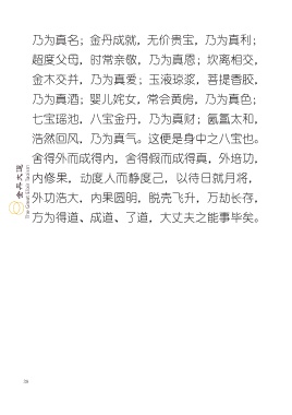 乃为真名;金丹成就,无价贵宝,乃为真利; 超度父母,时常亲敬,乃为真恩;坎离相交, 金木交并,乃为真爱;玉液琼浆,菩提香胶, 乃为真酒;婴儿姹女,常会黄房,乃为真色; 七宝瑶池,八宝金丹,乃为真财;氤氲太和, 浩然回风,乃为真气。这便是身中之八宝也。 舍得外而成得内,舍得假而成得真,外培功, 内修果,动度人而静度己,以待日就月将, 外功浩大,内果圆明,脱壳飞升,万劫长存, 方为得道、成道、了道,大丈夫之能事毕矣。 38