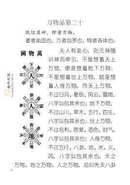 万物品第二十 既惊其神,即著万物。 著者执固也,万者包罗也,物者各体也。 夫人有妄心,则元神随 识神而牵引,不是想着天上 万物,便是想着地下万物; 不是想着世上万物,就是想 着人身万物。而天上万物, 不过日月、星辰、风云、雷雨, 八字以包其余也;地下万物, 不过山川、草木、五行、四生, 八字以包其余也;世上万物, 不过名利、恩爱、酒色、财气, 八字以包其余也;人身万物, 不过五行、八卦,地、水、火、 风,八字以包其余也。天之 万物、地之万物、人之万物,总归先天八卦 50