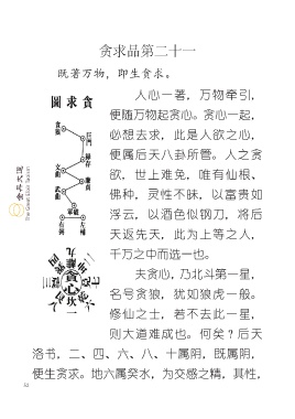 贪求品第二十一 既著万物,即生贪求。 人心一著,万物牵引, 便随万物起贪心。贪心一起, 必想去求,此是人欲之心, 便属后天八卦所管。人之贪 欲,世上难免,唯有仙根、 佛种,灵性不昧,以富贵如 浮云,以酒色似钢刀,将后 天返先天,此为上等之人, 千万之中而选一也。 夫贪心,乃北斗第一星, 名号贪狼,犹如狼虎一般。 修仙之士,若不去此一星, 则大道难成也。何矣?后天 洛书,二、四、六、八、十属阴,既属阴, 便生贪求。地六属癸水,为交感之精,其性, 52