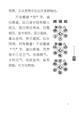 荣贵,又从荣贵中生出许多烦恼也。 不如看破“色”字,诚 心修道,自己身中现有婴儿 姹女,每日常近常亲,坎离 相交,金木相并,多少滋味, 难以言传,异日道成,仙女 同俦,何等尊重!不如看破 “气”字,诚心修道,而养 身中三花五气、浩然刚气、 太和元气,结成金丹,纵有 烦恼,化为乌有矣。 55