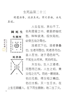 生死品第二十三 便遭浊辱,流浪生死。常沉苦海,永失 真道。 人生在世,贪心不了, 名利恩爱之中,便是烦恼忧 愁,种种波涛,但失陷处, 必受五浊之辱也。 流者沉下也,浪者事叠 也,生者河图也,死者洛书也。 言人在世,迷于酒色财气, 不知生从何来,死向何去。 夫生仙、生人之道者, 河图而已矣。人生之初,秉 父母之元气,而结一颗明珠, 名曰无极,得父母之精血, 名曰太极。天一生壬水,在 上生左眼瞳人,在下而生膀胱;地二生丁火, 56