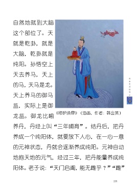 自然地就到大脑 这个部位了。天 就是乾卦,就是 大脑,乾卦就是 纯阳。孙悟空上 天去养马,天上 的马,天马是龙。 天上养马的御马 监,实际上是御 《移炉换鼎》(油画,作者:韩金英) 龙监。御龙比喻 养丹,丹经上叫“三年哺育”。结丹后,把丹 养成一个纯阳体,就要放下人心,在一心一意 的元神状态,丹就会逐渐养成纯阳。元神自动 地抱天地的元气,经过三年,把丹能量养成纯 阳体。老子说:“天门启阖,能无雌乎?”“雌” 225