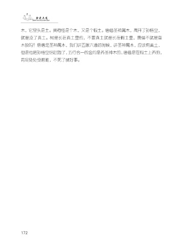 木,它里头是土。黄袍怪是个木,又是个假土。唐僧圣神属木,离开了孙悟空, 就是没了真土。树是长在真土里的,不要真土就是长在假土里,唐僧不就是奎 木狼吗?唐僧是圣神属木,我们讲五眼六通的时候,讲圣神属木,应该有真土, 但是他把孙悟空给赶跑了,五行合一的金丹是养圣神木的,唐僧是在假土上养的, 肯定处处受磨难,不死了就好事。 172