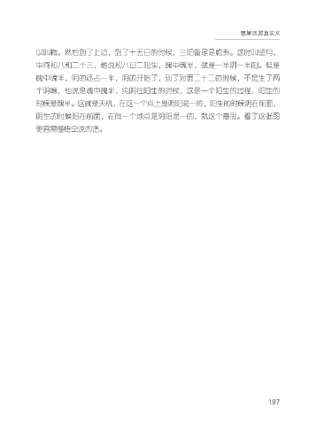 愿解西游真实义 以叫晦。然后到了上边,到了十五日的时候,三阳备足是乾卦。这时叫望月, 中间初八和二十三,他说初八日二阳生,魄中魂半,就是一半阴一半阳。但是 魄中魂半,阴的还占一半,阴的开始了,到了对面二十二的时候,不是生了两 个阴嘛,他说是魂中魄半,纯阴往阳生的时候,这是一个阳生的过程,阳生的 时候是魂半。这就是天机,在这一个点上是阴阳混一的,阳生的时候阴在前面, 阴生的时候阳在前面,在同一个地点是阴阳混一的,就这个意思。看了这张图 更容易懂悟空说的话。 197