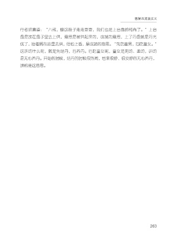 愿解西游真实义 行者欢喜道:“八戒,像这般子走走耍耍,我们也是上台盘的和尚了。”上台 盘是放在盘子里去上供,意思是被供起来的,成就的意思,上了丹盘就是丹光 成了,抬着搁在庙里去供,给他上香,是成就的意思。“先吃童男,后吃童女。” 这讲的什么呢,就是先结丹,后养丹。后吃童女呢,童女是阴的、柔的,讲的 是无心养丹。开始的时候,结丹的时候很热闹,后来很静、很安静的无心养丹, 讲的是这意思。 263