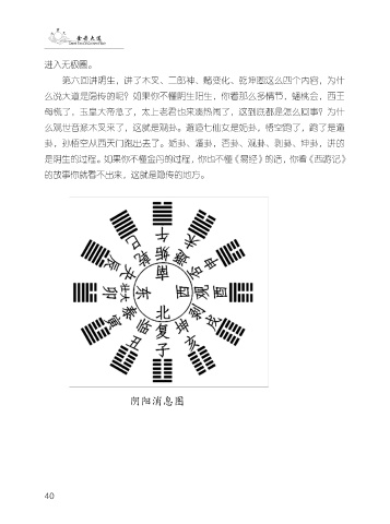 进入无极圈。 第六回讲阴生,讲了木叉、二郎神、赌变化、乾坤圈这么四个内容,为什 么说大道是隐传的呢?如果你不懂阴生阳生,你看那么多情节,蟠桃会,西王 母慌了,玉皇大帝急了,太上老君也来凑热闹了,这到底都是怎么回事?为什 么观世音派木叉来了,这就是观卦。邂逅七仙女是姤卦,悟空跑了,跑了是遁 卦,孙悟空从西天门跑出去了。姤卦、遁卦,否卦、观卦、剥卦、坤卦,讲的 是阴生的过程。如果你不懂金丹的过程,你也不懂《易经》的话,你看《西游记》 的故事你就看不出来,这就是隐传的地方。 40