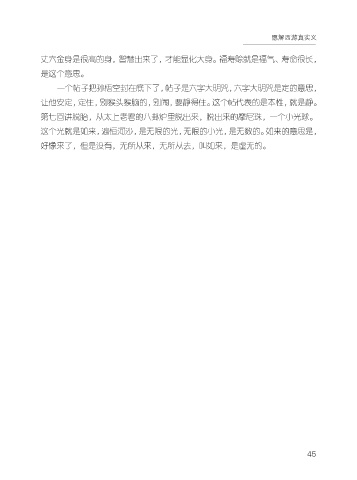愿解西游真实义 丈六金身是很高的身,智慧出来了,才能显化大身。福寿赊就是福气、寿命很长, 是这个意思。 一个帖子把孙悟空封在底下了,帖子是六字大明咒,六字大明咒是定的意思, 让他安定,定住,别猴头猴脑的,别闹,要静得住。这个帖代表的是本性,就是静。 第七回讲脱胎,从太上老君的八卦炉里脱出来,脱出来的摩尼珠,一个小光球。 这个光就是如来,遍恒河沙,是无限的光,无限的小光,是无数的。如来的意思是, 好像来了,但是没有,无所从来,无所从去,叫如来,是虚无的。 45